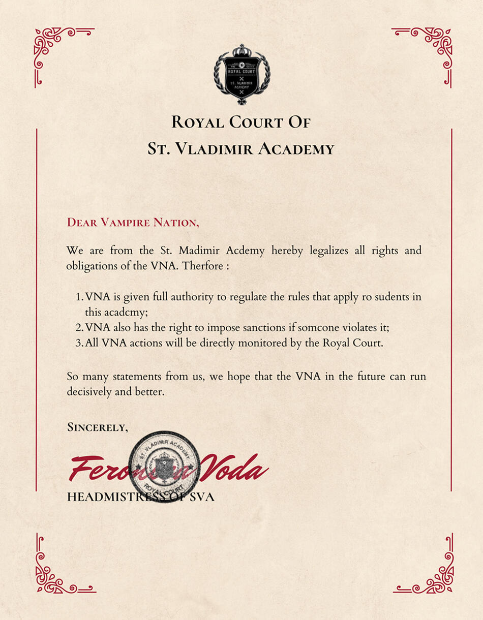 VNA diberikan kuasa penuh untuk memberikan sanksi pada murid dan alumni yang melanggar segala aturan St. Vladimir Academy.